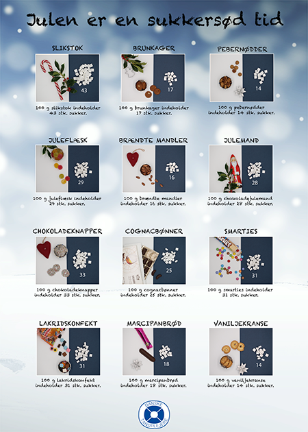 Plakaten kan pynte op i venteværelset og samtidig være en øjenåbner, hvad angår indholdet af sukker i de søde sager, som hører julen til. Plakaten fås i to versioner. Det er Danske Tandplejeres kommunikationsudvalg, der står bag plakaten, og det er tandplejer og medlem af Kommunikationsudvalget, Carina Løvstad, der har taget billederne, og som har stået for redigering og den grafiske udformning.